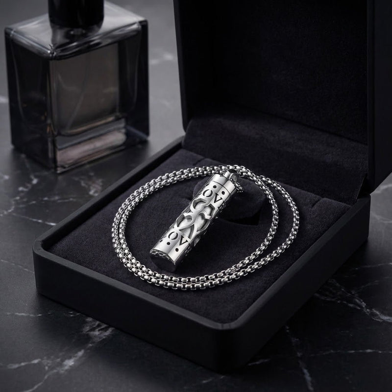 Unutar elegantnog čeličnog cilindra nalazi se upijajuće jezgro koje čuva miris koji vas definiše. Pre nego što poklonite ogrlicu, jednostavno poprskajte unutrašnjost vašim parfemom – onim po kome vas partner prepoznaje i pamti. Na taj način ne poklanjate predmet, već osećaj bliskosti i sigurnosti.